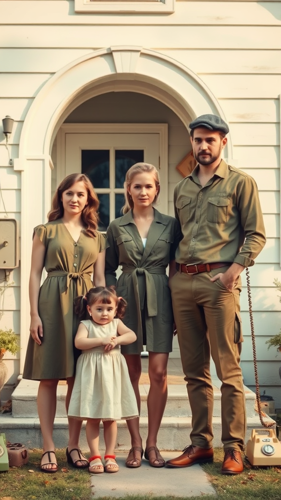 A whimsical scene unfolds, depicting a young girl, a sophisticated lady, and a gentleman standing together before a vintage house. Their surroundings are bathed in a dreamy light turquoise and soft light yellow hue, reminiscent of a post-'70s ego generation aesthetic. The image evokes the nostalgic charm of a calotype photograph with a playful twist akin to Alex Hirsch's unique storytelling. Nearby, a rotary phone hangs off the hook, nodding to a 'mommy's on-the-phonecore' vibe. The trio is dressed in olive cotton garments, blending seamlessly with the sunlit environment, their full bodies captured in this moment of quiet companionship and timeless camaraderie.