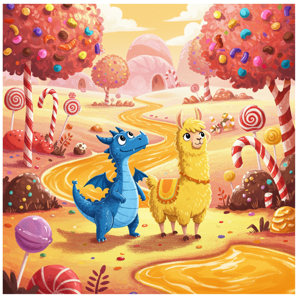 A whimsical scene unfolds, featuring Albi, the friendly blue dragon, and his companion, the lemony llama, as they embark on an enchanting journey through a vibrant candy land. They traverse a landscape dotted with candy cane trees that twist and twirl into the sky and lollipop flowers blooming in an array of vivid colors. A glistening river of golden honey meanders through the sugary terrain, reflecting the sun's warm glow. Albi and the llama gaze around in awe and delight, their eyes sparkling with the thrill of exploration and discovery. The whimsical world is brought to life with a kaleidoscope of colors, from the rich blues of Albi's scales to the sunny yellow of the llama's fur. All around them, a sense of joy and wonder permeates the air, as the magical landscape offers infinite possibilities for adventure.