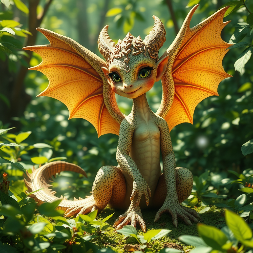 A whimsical scene unfolds in a vibrant forest where a charming dragon-girl hybrid sits gracefully amidst the verdant foliage. Her face is beautifully delicate, featuring large, expressive eyes reminiscent of anime art. Adorning her back are magnificent dragon wings, intricately textured with gleaming scales that catch the sunlight. The wings carry the intricate patterning of eagle feathers, harmoniously blending with the aerodynamic form of falcon wings. Her lizard-like legs are poised in a Komodo dragon stance, exuding a sense of strength and balance. Magic seems to shimmer around her in the dappled light, creating an enchanting atmosphere. The realism of her skin's texture contrasts with the ethereal surroundings, giving her an otherworldly presence.