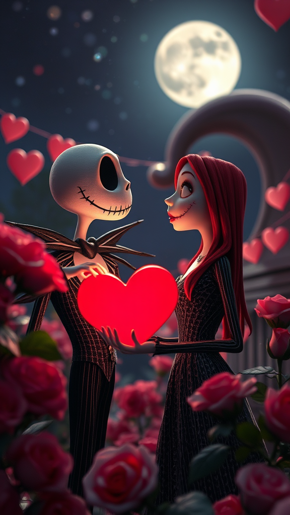A whimsical scene unfolds in the style of Tim Burton's stop motion animation, where Jack Skellington and Sally exchange tender glances amidst a Valentine love fest. The night sky, adorned with a glowing moon, casts a silvery glow on the festivities. Vibrant roses and heart-shaped decorations surround the duo, adding bursts of color to the enchanting evening. Cinematic composition and depth of field bring focus to their affectionate expressions, capturing a magical moment suspended in time, while the hauntingly beautiful ambiance reflects the unique charm of The Nightmare Before Valentine's Day.