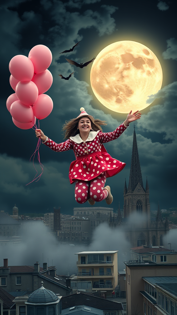 A whimsical scene unfolds with a cheerful young woman embodying a playful flying clown, exuding a kind smile and generous spirit as she soars above a bustling cityscape. She wears vibrant polka-dot leggings, holding a bunch of pink balloons that add a splash of color against the ominous midnight sky. In the background, a majestic cathedral stands tall, partially shrouded by volumetric fog. A luminous full moon casts an ethereal glow, guiding her through the night as bats swoop and swirl beneath a sky dotted with scattered clouds. This hyper-realistic scene, reminiscent of an Albert Bierstadt oil painting, captures the intriguing contrast of a lively urban world under the watchful gaze of a mysterious sky.