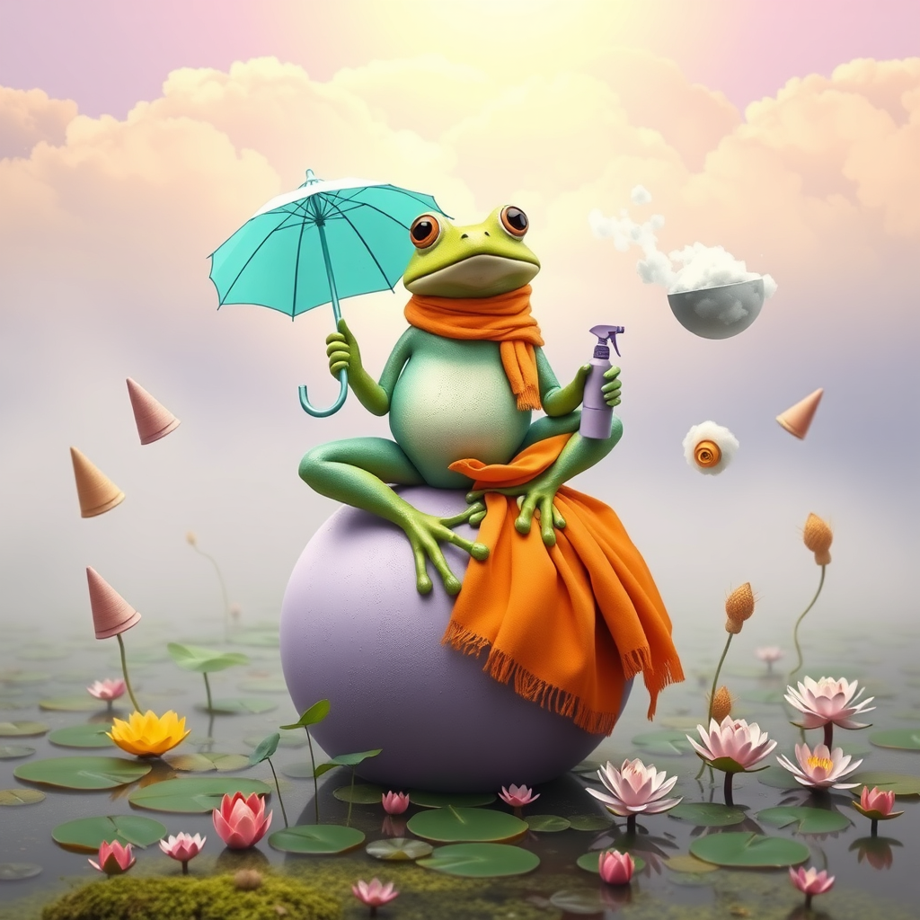 A whimsical scene unfolds with a large, green, anthropomorphic frog exuding a serene demeanor, perched atop a pastel purple ball draped in a vibrant orange scarf. The frog is gracefully holding a turquoise umbrella in one hand, while the other is gently misting the air with a tiny, lavender spray bottle. Surrounding this tranquil figure are a myriad of floating, whimsical shapes, where cone-like objects in soft pink and sunlit yellow dance alongside a bowl brimming with a fluffy, cloud-like substance. The sky in the background is an ethereal blend of soft lavender and creamy peach clouds, casting a surreal glow over the setting. Below, the ground appears as an enchanting blend of a swampy, mossy landscape, dotted with floating lilies and curious little plants, all contributing to the playful, dreamlike essence of the scene.
