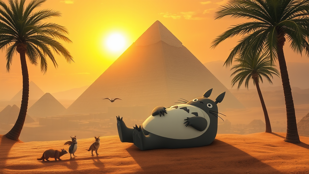 A whimsical scene where Totoro lounges playfully among the grand pyramids of Giza, with the sun setting behind, casting a golden hue over the ancient stones. The air is filled with an air of magic as gentle breezes carry the desert’s warm sands around. Totoro interacts with curious local wildlife, as tiny spirits dance amidst palm trees, creating a harmony between the legendary creature and the timeless landscape.