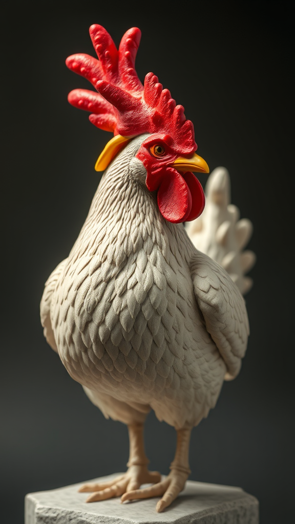 A whimsical sculpture of a chicken donning a playful chicken-shaped hat, capturing the graceful motion reminiscent of Lois Greenfield's photography. The piece exudes ultra-realism with detailed textures, blending the dynamic essence of time-lapse photography. The composition reflects the artistic finesse of Xu Beihong, while hinting at the impressionistic style of Frank Weston Benson. Clever cartoonish elements are subtly interwoven, adding a humorous twist to the elegant, life-like representation. The unique proportions (45:56) enhance the statue's charm, embodying a blend of fine art and witty storytelling.