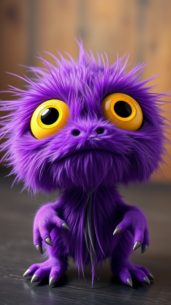 A whimsical, small, purple, fluffy creature with vibrant yellow eyes, inspired by a playful Pixar style. Rendered in Unreal Engine, this 3D image features realistic fur textures and a fisheye art style. Its adorable, oversized, circular eyes glisten with reflection. The creature possesses an intricate, detailed design with two expressive heads and faces, slightly out of frame, each displaying unique emotions. Its elongated neck and quirky posture give it an endearing charm, despite its odd, whimsical anatomy. The hands are quirky and deformed, yet somehow add to its unique character. It's a fantasy figure, an animated toy come to life with surreal elements and vivid, whimsical colors. Although intentionally abstract and disfigured in parts, this charming little monster radiates a unique charisma that stands out on platforms like ArtStation. The overall aesthetic is a mix of surreal and cute, capturing the essence of a beloved animated character with a touch of quirky imperfection.