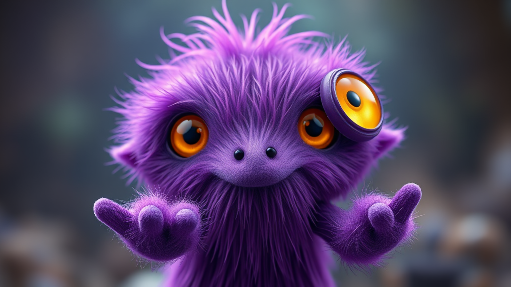 A whimsical, small, purple, furry monster with gleaming yellow eyes stands as if from a fairy tale. It boasts realistic fur rendered in exquisite detail, captured in a 3D style reminiscent of an animated Pixar character. Each of its two heads has cute, large, reflective circular eyes that draw you in. The creature's features are highlighted by a fish-eye lens perspective, giving a charmingly distorted view with its long neck, intricate facial details, and contorted fingers adding to its quirky charm. Its design conveys an unreal cinematic smoothness, despite sporting morphed limbs and hands that suggest an abstract, surreal twist. This creature's playful, otherworldly nature is highlighted by a kaleidoscope of vibrant colors that defy standard palettes, drawing viewers in with its unexpectedly mesmerizing morphology. Due to its amusingly bizarre appearance, it's an artwork that might trend on ArtStation, capturing attention with its imaginative and slightly peculiar anatomy.