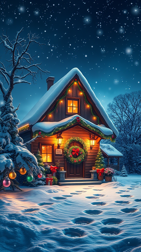 A whimsical snowy night scene featuring a charming house adorned with twinkling Christmas lights, colorful ornaments, and a glowing wreath on the door, surrounded by frosted trees and a sky filled with luminous stars, creating a magical, cinematic wonderland in high-definition quality.