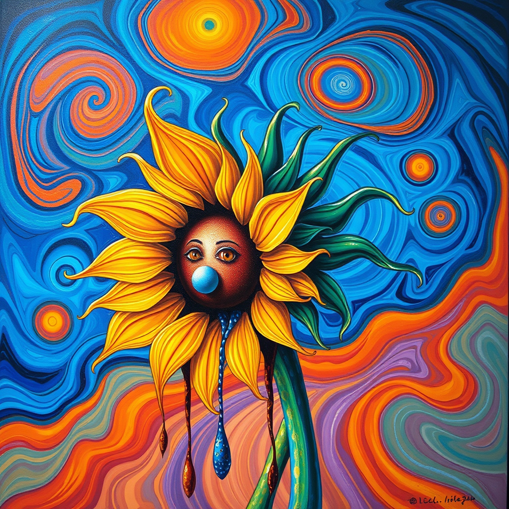 A whimsical surrealist painting of a sunflower with vibrant, swirling colors, its petals and stem appearing to drip and melt in a dreamlike fashion; reminiscent of Salvador Dali's fluid forms and Pablo Picasso's abstract geometry, with elongated shapes and vivid, distorted perspectives; the sunflower's face carries an enigmatic expression, set against a swirling, kaleidoscopic background of blues and oranges that seem to dance around it; an ethereal, otherworldly scene that embodies the merging of reality and fantasy in a captivating, psychedelic display.