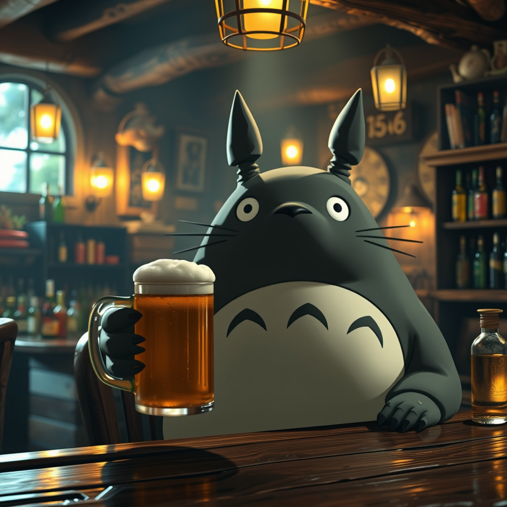 A whimsical Totoro sitting at a cozy bar, a frothy beer mug in hand, with softly glowing, cinematic lighting casting warm hues and gentle shadows, capturing the magical essence and photorealistic style of Studio Ghibli. The setting is a rustic, enchanted forest pub with wooden beams and glowing lanterns, where Totoro's expression is a blend of tipsy delight and serene contentment, surrounded by colorful bottles and the faint mist of mystical ambiance.