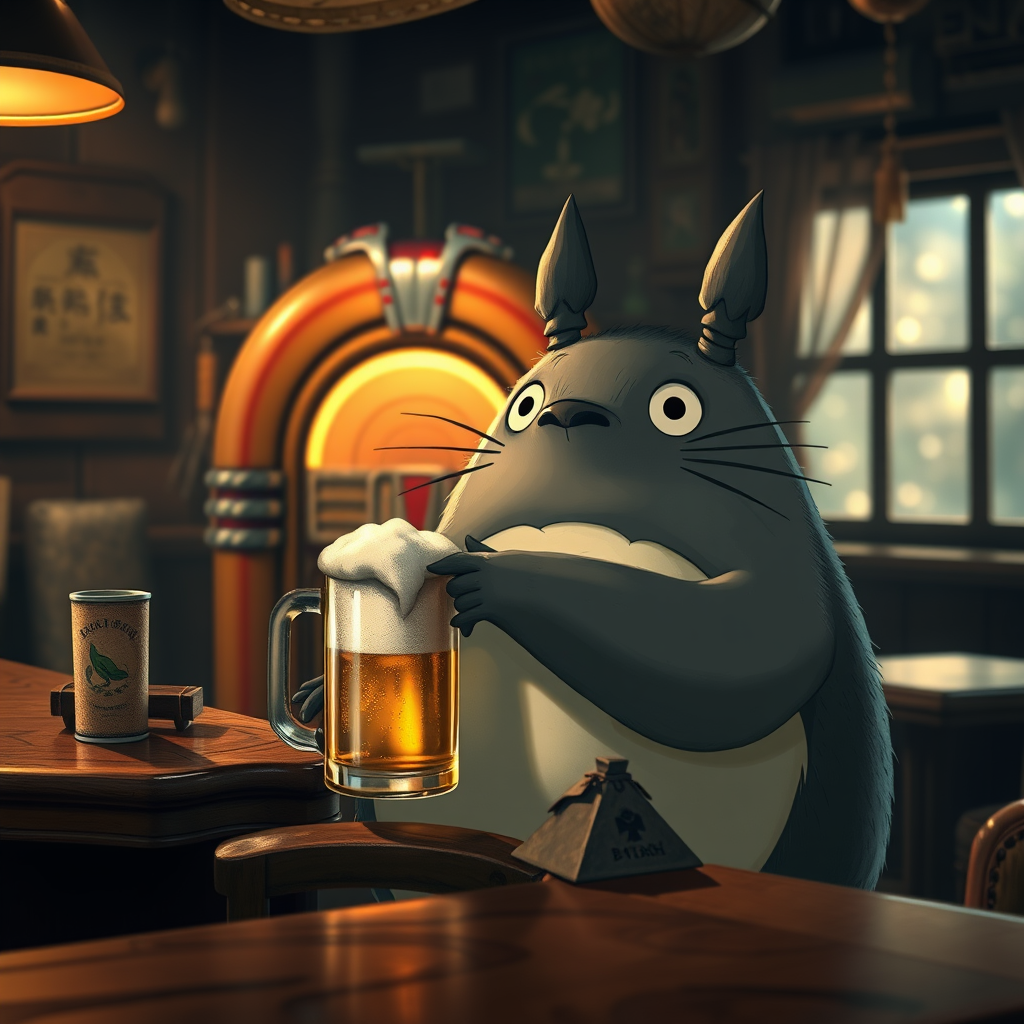 A whimsical Totoro sitting at a cozy bar, mischievously clutching a frothy beer mug, surrounded by softly glowing cinematic lighting, characterized by the enchanting photorealistic style of Studio Ghibli, a dusty jukebox in the background playing soft tunes, gentle shadows playing around Totoro's fluffy fur, a hint of a warm breeze rustling through the open windows, creating a magical, slightly tipsy ambiance.