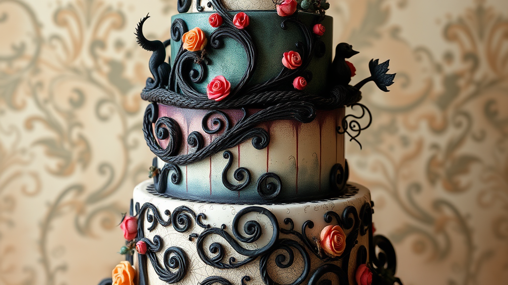 a whimsical wedding cake designed in the style of tim burton, featuring gothic and quirky elements, layers of mismatched tiers adorned with dark yet vibrant colors, twisted and swirling patterns, and elegantly eerie decorations; intricate detailing with a touch of the fantastical, incorporating unusual shapes and playful, slightly macabre accents, exuding a sense of charming, otherworldly romance and imagination