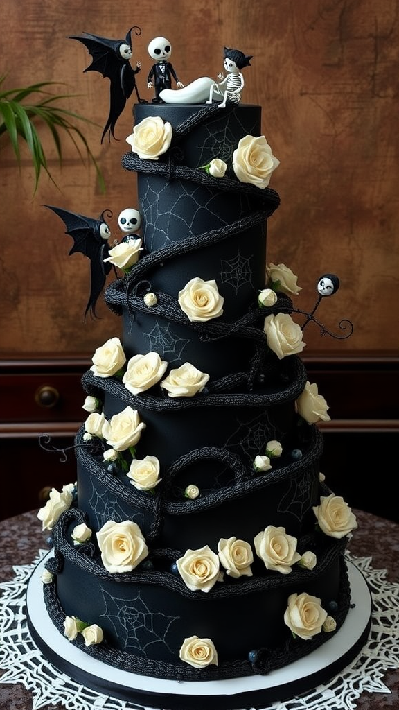 A whimsical wedding cake inspired by Tim Burton, featuring twisted, spiraling tiers adorned with dark, gothic details and eerie, yet charming decorations. The cake is enveloped in deep, moody colors like midnight blue and black, accented with pale, ghostly roses and delicate spiderweb patterns. Quirky characters like skeletal figures and peculiar creatures perch on each tier, adding an element of playful eeriness. The overall atmosphere evokes a sense of fantastical wonder and dark romance, capturing the essence of a surreal, Burton-esque celebration.