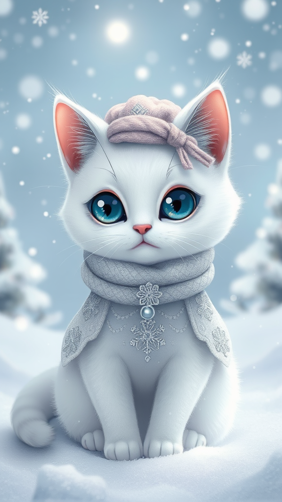 A whimsical white cat, charming and kawaii, exuding a magical and ethereal aura, dressed in enchanting winter fashion adorned with delicate silver filigree patterns. Set against a breathtaking snowy landscape, the scene sparkles with twinkling stars and gentle snowfall, crafted in the artistic vision of Yoshitomo Nara, Ray Caesar, and Studio Ghibli. The feline's eyes reflect a surreal wonder, adding to the enchantment of the winter wonderland, as light glows softly around it.
