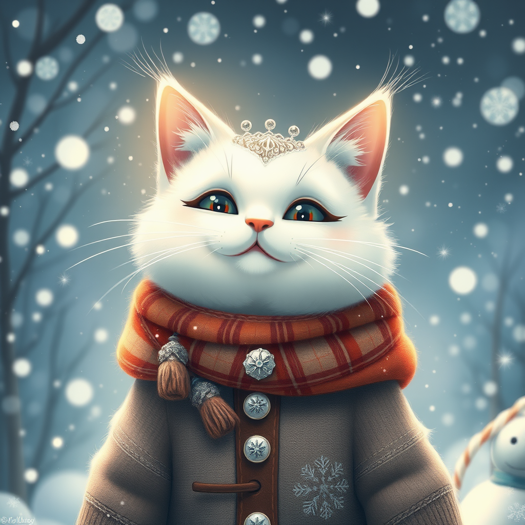 A whimsical white cat exuding adorable kawaii charm, imbued with a touch of magic and ethereal surrealism, adorned in winter fashion embellished with delicate silver filigree. Set against a breathtaking snowy backdrop, the scene is infused with inspiration from Yoshitomo Nara, Ray Caesar, and Studio Ghibli. The atmosphere glistens with sparkling snowflakes and enchanting starlight, capturing the magical serenity of a winter wonderland.