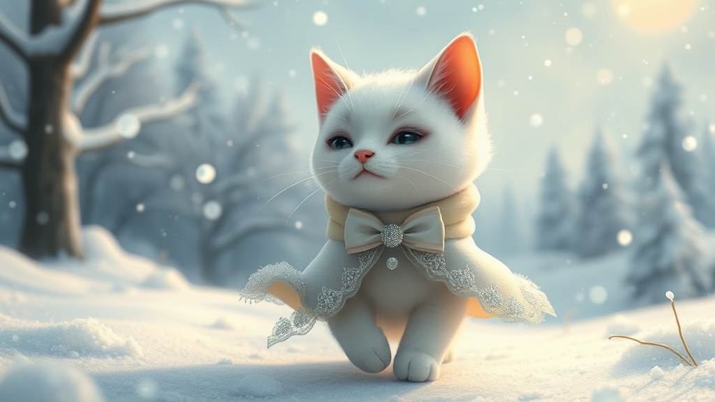 A whimsical white cat, irresistibly cute and ethereal, draped in enchanting winter fashion adorned with delicate silver filigree accents, frolicking in a snowy wonderland. This surreal scene captures the essence of enchantment, with influences from Yoshitomo Nara, Ray Caesar, and Studio Ghibli, where gentle snowflakes dance through a picturesque winter landscape, casting a magical glow under a starlit sky. The setting feels as if it were plucked from a dreamy animated world, blending kawaii elements with artistic elegance and a touch of otherworldly charm.
