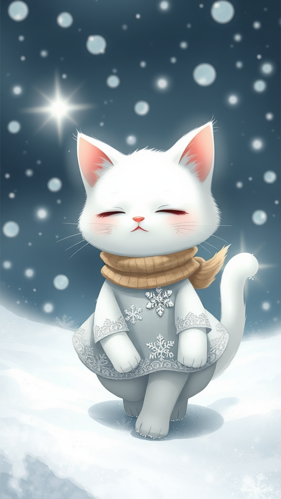 A whimsical white cat with an aura of innocence and charm, embodying a dreamlike blend of cute and magical elements. Dressed in enchanting winter fashion with delicate silver filigree embellishments that glisten like frost, the scene is set in a snowy wonderland dotted with ethereal and surreal touches. Designed with the heartful emotion of Yoshitomo Nara, the imaginative elegance of Ray Caesar, and the enchanting storytelling of Studio Ghibli, the environment sparkles with snowflakes, casting a serene glow. Amidst the tranquil snowfall, the cat moves gracefully, radiating a sense of wonder, as stars twinkle softly in the frosty air, inviting a feeling of childlike wonder and nostalgia.