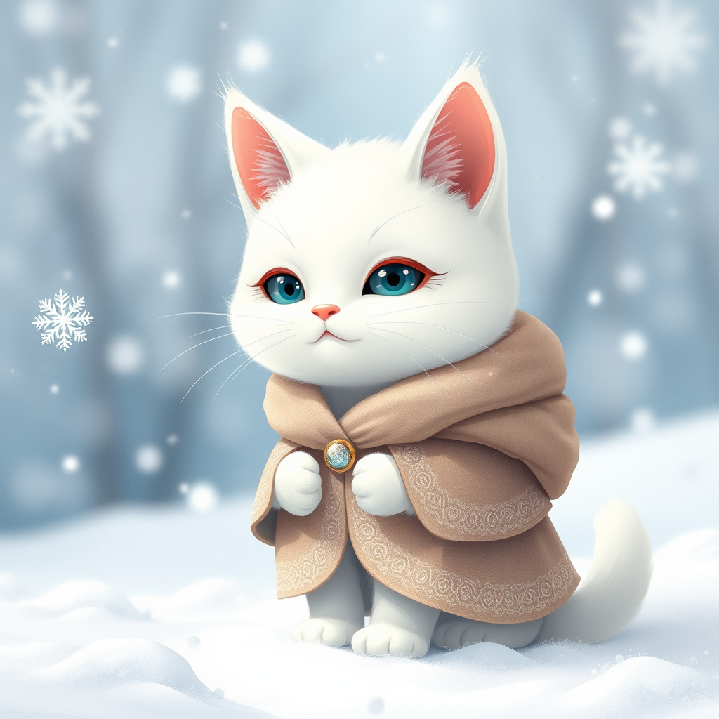 A whimsical, white cat with an endearing, kawaii appearance exudes a sense of magic and ethereal charm. Draped in winter fashion adorned with delicate silver filigree details, it stands in an enchanting snowy landscape. The scene, reminiscent of works by Yoshitomo Nara, Ray Caesar, and Studio Ghibli, radiates a surreal, dreamlike quality. Snowflakes dance in the air, twinkling like tiny stars amidst the serene, frosty backdrop. The cat's eyes sparkle with an otherworldly glow, adding to its captivating presence in this mystical winter wonderland.
