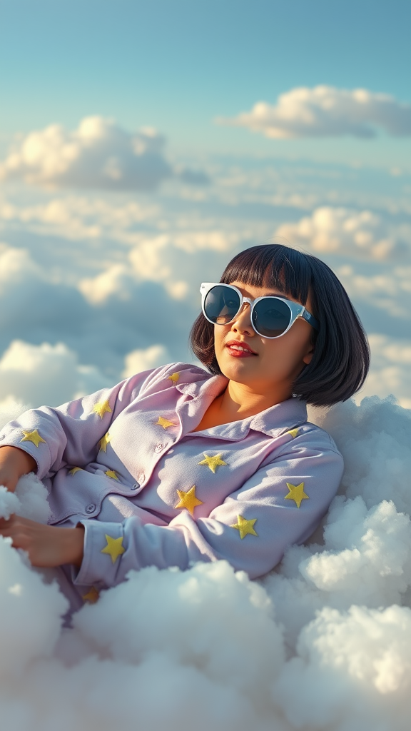 A whimsical woman lounges atop a bed of fluffy white clouds, her large, quirky sunglasses reflecting the gentle sunlight. She's dressed in cozy lavender pajamas adorned with playful yellow stars, adding a touch of celestial charm. Her short, dark bob haircut frames her face with playful elegance. The serene backdrop features an expansive sky painted in gentle pastel blue, dotted with whimsical cloud formations. The scene is captured by the imaginative eye of Jimmy Marble, showcasing muted earthy hues and soothing soft tones, with the overall composition radiating a sense of dreamy tranquility.