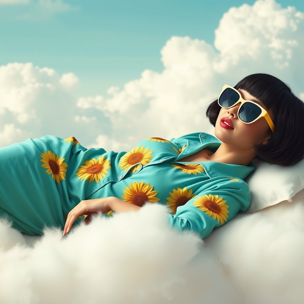 A whimsical woman lounging atop soft, pillowy clouds, adorned in oversized sunglasses and vibrant turquoise pajamas embellished with cheerful sunflower motifs. Her short dark hair is styled in a playful bob cut, perfectly framing her face. The serene backdrop features a pastel blue sky with fluffy white cloud formations, capturing a dreamlike essence. Photographed by Jimmy Marble, the image exudes a calming atmosphere with its muted earthy hues and gentle tones.