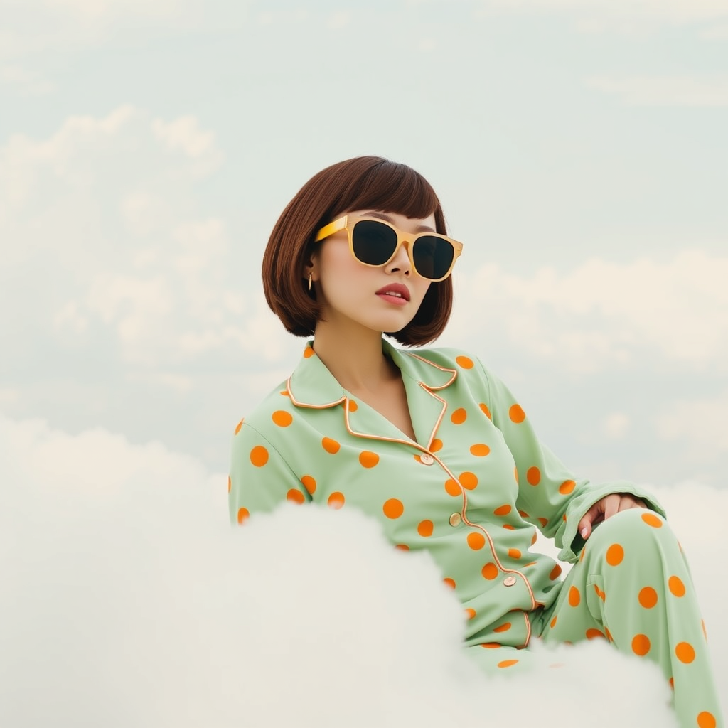 A whimsical woman perched on billowy white clouds, adorned in oversized sunglasses and pastel green pajamas adorned with orange polka dots, her short chestnut hair styled in a sleek bob cut. The background is a serene pale blue sky, dotted with gentle white cloud formations. Shot by the imaginative lens of Jimmy Marble, encapsulating a palette of soft, muted earthy tones.