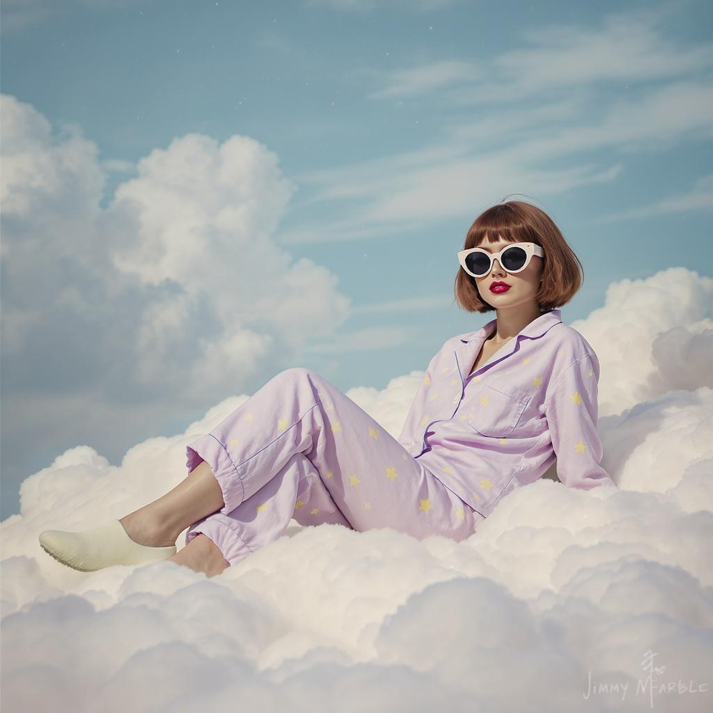 A whimsical woman reclines atop a bed of puffy clouds, her large, round sunglasses accentuating her playful aura. She wears pastel lavender pajamas sprinkled with cheerful yellow stars, her short auburn hair styled in a chic bob cut. The backdrop is a serene, powder blue sky dotted with dreamy cloud formations, captured in the distinctive style of a Jimmy Marble photograph. The scene is infused with muted, earthy tones and gentle, soothing hues.