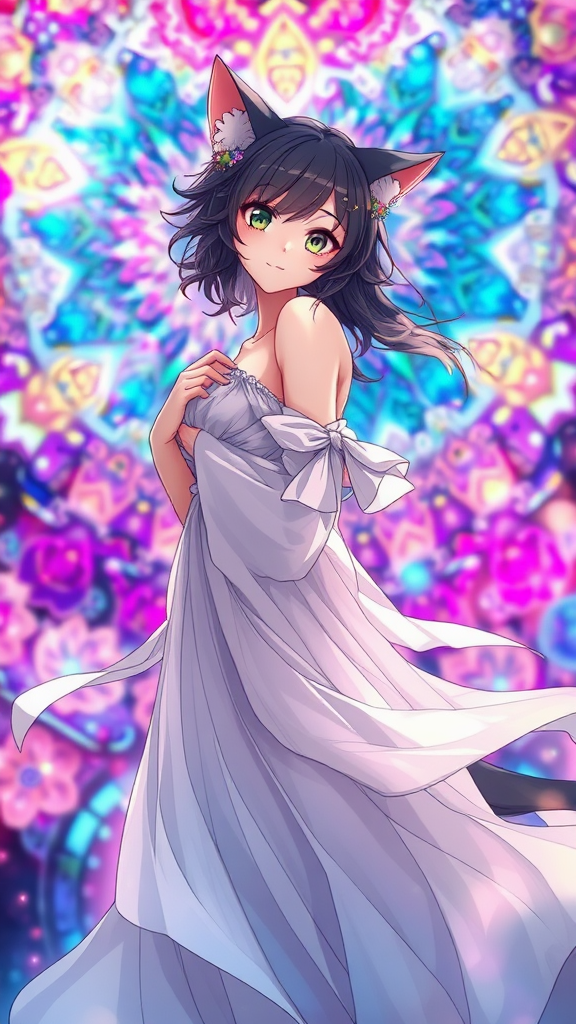 A whimsical woman with playful cat ears and a flowing elegant dress stands gracefully against a vibrant, kaleidoscopic background. Her striking presence is captured in a highly detailed digital anime style, showcasing her ethereal beauty. Inspired by the enchanting fantasy artwork reminiscent of Yuumei, this scene embodies a harmonious blend of fantasy and reality. The colors and intricate details create an immersive atmosphere, echoing the artistry of onmyoji-inspired illustrations. The image is designed for ultra-high-definition displays, presenting a mesmerizing 4k anime art wallpaper that captures the imagination.
