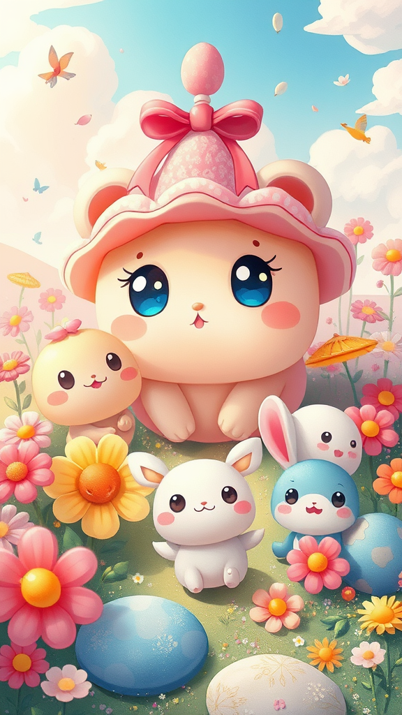 A whimsical world of kawaii delight where every corner is bursting with charm and joy; imagine an adorable landscape filled with brightly colored critters and objects, each one infused with anime-inspired whimsy and intricate details. Cheerful scenes of cuddly creatures frolic amidst vibrant flowers and candy-hued skies, their wide, sparkling eyes radiating a sense of playful wonder and innocence. Sweet, heartwarming moments captured in vivid hues invite you to lose yourself in a universe of endless smiles and enchanting detail.