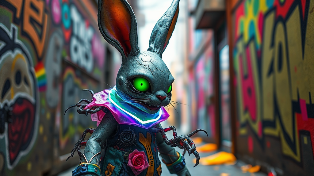 A whimsical yet eerie zombie bunny adorned with a vibrant, glowing collar, set in a cyberpunk futuristic world. Its playful yet shadowy presence is accentuated by a patchwork of colorful, eclectic costumes, merging the innocence of a lit kid aesthetic with a surreal honeycore twist. This creature, composed of writhing insects, moves through an alleyway splashed with bright, graffiti-like colors, creating a striking contrast of unsettling beauty.