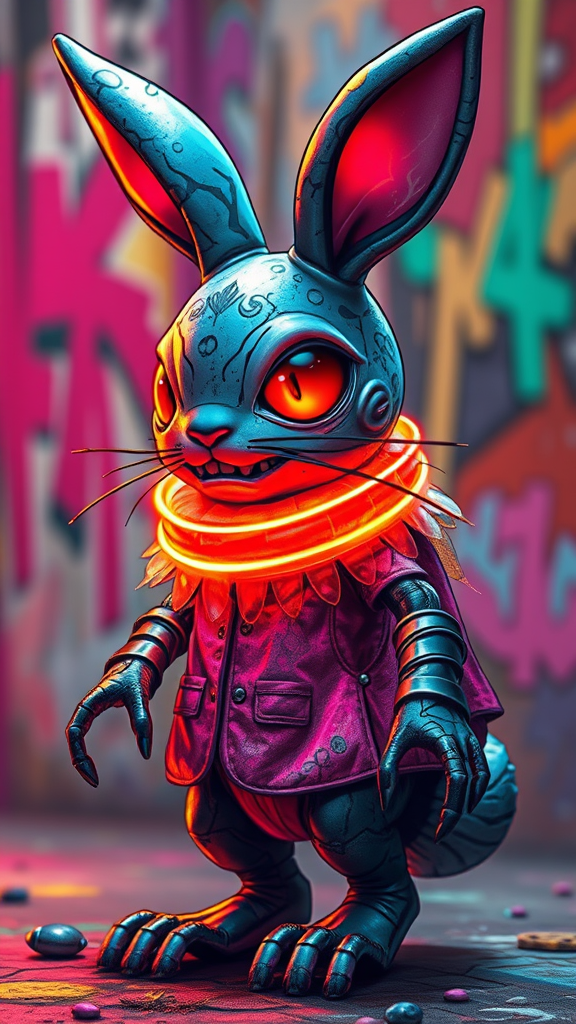 A whimsical yet eerie zombie bunny adorned with a shimmering neon collar, embodying the essence of cyberpunk futurism with a playful yet ominous aura. Its form is animated with the mesmerizing movement of insects, cloaked in vibrant, kaleidoscopic costumes. This fantastical creature dances through a world drenched in the vivid hues of graffiti art, its presence akin to a lit kid in a honeycore dreamscape, where darkness merges with a riot of colors and textures.