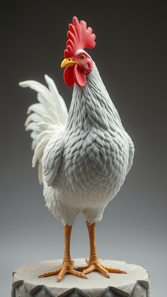 A whimsical yet ultra-realistic depiction of a chicken adorned with a miniature chicken hat standing proudly, captured in the dynamic and graceful style reminiscent of Lois Greenfield. The sculpture exudes the essence of Xu Beihong's meticulous attention to detail, while also incorporating the soft, light-infused brushwork characteristic of Frank Weston Benson. The scene unfolds like a clever, witty cartoon brought to life through a series of time-lapse photography, revealing the chicken’s playful character and intricate features with astonishing realism. The dimensions are artistically rendered in an aspect ratio of 45:56.