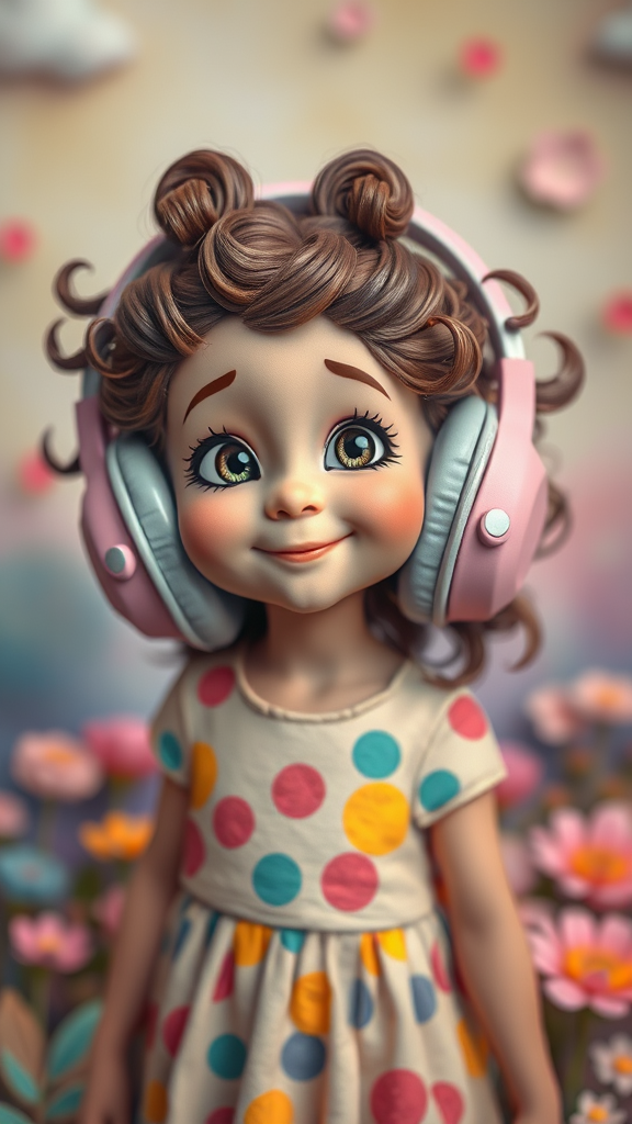 A whimsical young girl with oversized headphones adorned in a Disney-esque style, crafted with a delicate clay texture giving her a magical, handcrafted look. Her eyes are wide with wonder, her expression filled with joy as she gets lost in her musical world. She stands amidst an enchanting backdrop of pastel hues, resembling a dreamlike landscape where imagination knows no bounds. Her hair is styled in playful curls, enhancing her youthful exuberance, and her attire is vibrant and colorful, reflecting her lively spirit.