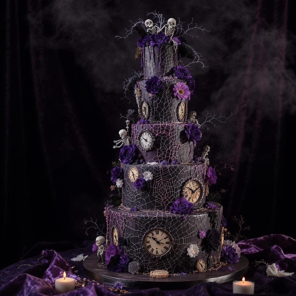 A whimsically gothic wedding cake inspired by Tim Burton, featuring towering, asymmetrical layers adorned with intricate, darkly ornate designs. The cake is embellished with a palette of deep purples, blacks, and whites, intertwined with delicate cobweb patterns and surreal, twisted floral motifs. Playful yet eerie embellishments like miniature skeleton figures and vintage clock faces are scattered across the surfaces, all under a dim, moody lighting that enhances the mysterious and enchanting atmosphere.