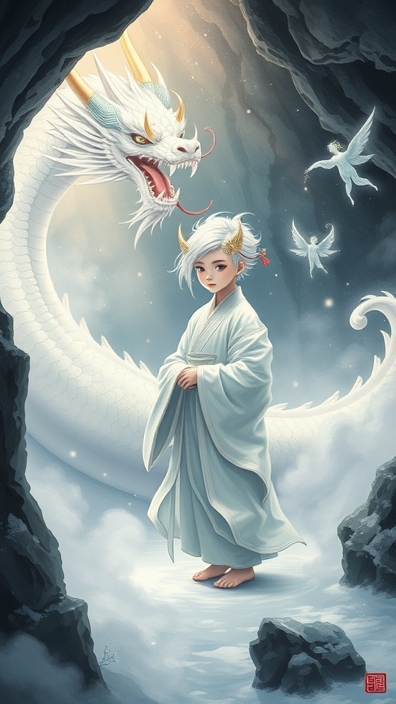 A white-haired Chinese boy resides in a mystic cave, accompanied by a celestial aura. Adorned in a flowing white Daofu and a glimmering headband, he stands alongside a majestic Chinese dragon. The scene is painted in the delicate style of Japanese Ukiyo-e, capturing the enchanting beauty of a Chinese fairy tale. Around them, mist swirls through the air, with a gentle layer of white snow blanketing the ground, creating a serene and ethereal atmosphere. Graceful figures dance in the background, adding to the mystical allure of this enchanted world.