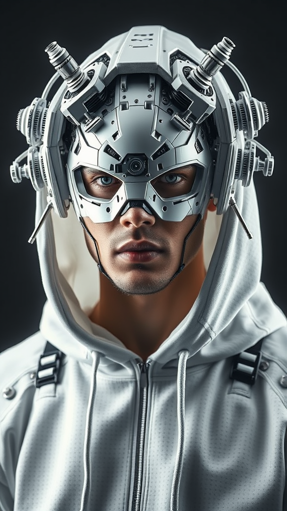A white man wearing a hoodie with a cyberpunk aesthetic, featuring a head adorned with robotic elements and shiny, glossy surfaces. The design exhibits controlled chaos with a balance of symmetrical asymmetry, rendered in a color palette of dark whites and silvers. The image captures the essence of an associated press photo, imbued with futuristic and edgy visuals.