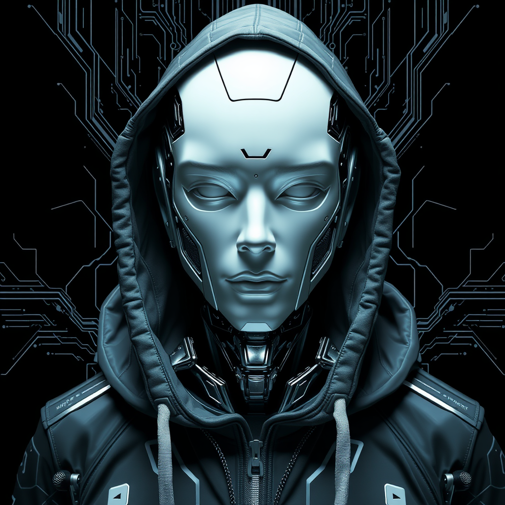 A white manβs head adorned with a sleek hoodie, envisioned in a dynamic cyberpunk style. The imagery incorporates robotic motifs with an interplay of shiny and glossy textures. It embodies controlled chaos and symmetrical asymmetry, resembling an Associated Press photo. The color palette features dark whites and silvers, with intricate details reflecting a futuristic aesthetic.