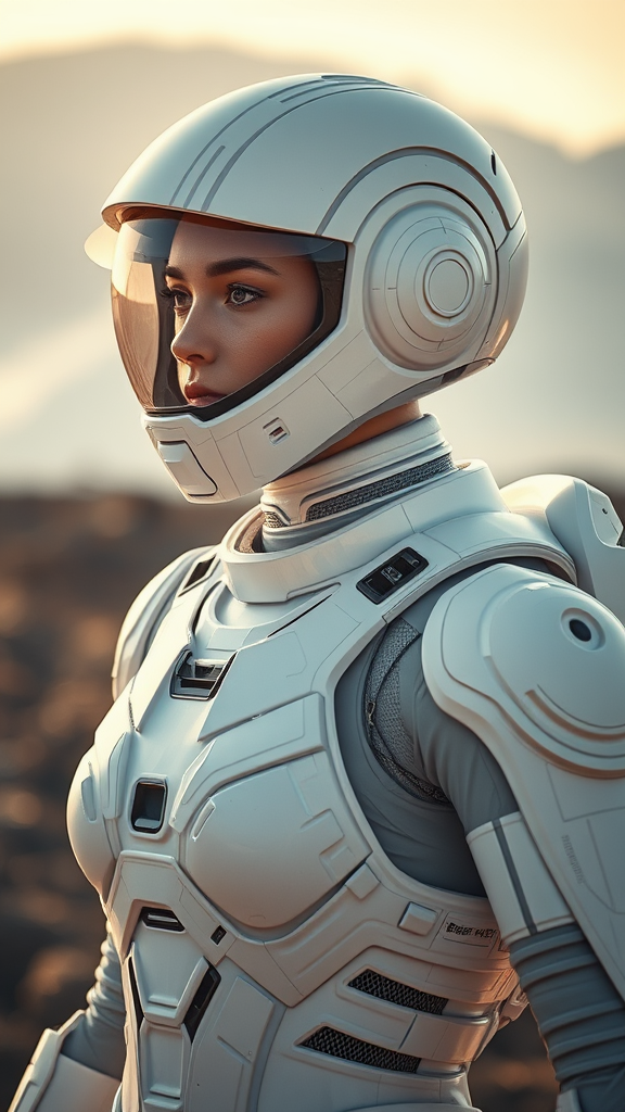 A white sci-fi female armored suit features intricate cybernetic designs, complete with a high-tech helmet and seamless full-body protection. The armor is insulated for space travel, with sections that highlight fine, detailed craftsmanship. Her bald head is visible through a clear visor in the helmet, enhancing the futuristic theme. The setting is an outdoor scene bathed in natural light, typical of a sci-fi movie aesthetic. The photorealistic image employs cinematic rendering and advanced ray tracing techniques to emphasize depth and realism. The third-person perspective offers a sweeping view, incorporating a blur effect and long exposure to convey motion and energy. The scene is captured in 8K Ultra-HD resolution, highlighting every intricate detail with moody and cinematic lighting, providing a visually striking representation of futuristic attire and technology.