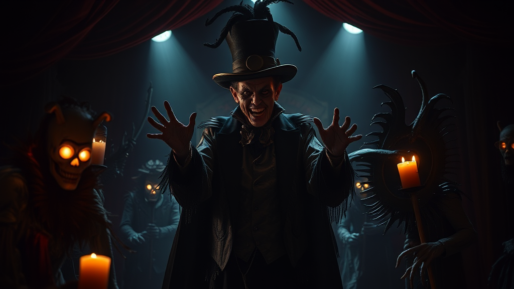 A wickedly captivating master of ceremonies, with an aura of malevolence and a touch of madness, leads a chillingly dark and grotesque circus performance. Drenched in shadows, the sinister spectacle features an intricately detailed set and costumes that evoke both horror and wonder. The dramatic interplay of light and shadow enhances the photorealistic scene, as the eerie atmosphere unfolds with cinematic grandeur in an 8k resolution, bringing the nightmare to life in stunning vertical composition.
