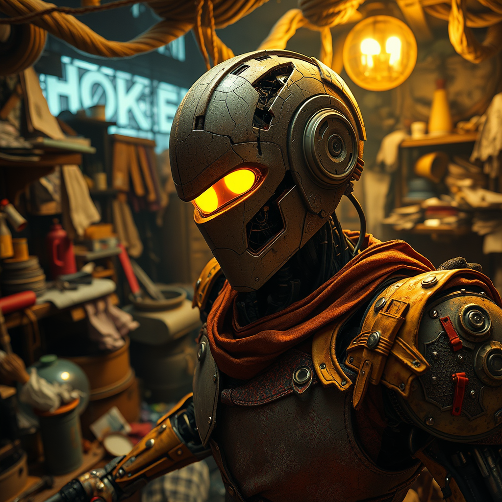 A wide-angle environmental shot captures a cluttered and messy shack, where the atmosphere is dense with chaos. The focus is on a dramatic action scene - a robot, shattered into pieces, its glowing yellow visor prominent, embodies a sci-fi cyberpunk knight. The robot's detailed features reflect a realistic, intricate design reminiscent of James Gurney and Katsuhiro Otomo's styles. The scene is lit with cozy indoor lighting, accentuating the vibrant, photo-realistic textures and the porcelain cracked skin of the robot. Surrounding elements and the vivid setting channel the theatrical essence of Craig Mullins and Greg Rutkowski's works, blending the organic with the mechanized. The entire composition is rendered in 8k with sharp focus, employing cinematic lighting and an ambiance akin to a fantastical reality. This intricate depiction feels like a striking piece trending on platforms like Artstation, where every detail from the tattered, torn shirt to the volumetric light speaks volumes of a world submerged in both vibrant nature and mechanical strife, inspired by the dynamic visions of Pete Morbacher and Tuomas Korpi.