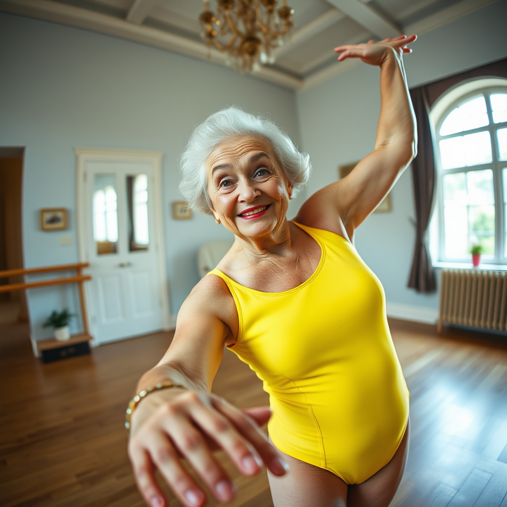 A wide-angle lens captures the humorous moment as a grandmother in a brightly colored leotard attempts a plié. Her face is in sharp focus, highlighting her comical expression and perfectly symmetrical features. The room is filled with a playful energy, as her graceful yet quirky attempt at a ballet move contrasts with her years of wisdom and experience.