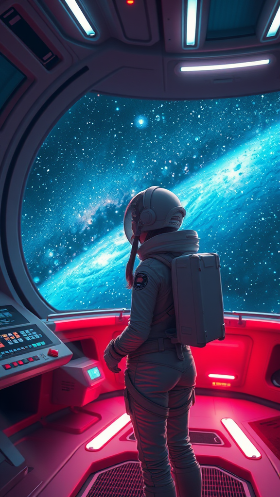 A wide angle shot of a solitary astronaut girl in a pristine, futuristic spaceship command room gazing out at the vast, awe-inspiring galaxy. The scene is illuminated by sci-fi neon lights casting an ethereal glow, creating a fantastical atmosphere. The astronaut's uniform is intricately designed, combining elegance with a high level of detail. This digital painting captures a sense of wonder and exploration, inspired by the art styles of Tian Zi, WLOP, and Alphonse Mucha, emphasizing smooth yet sharp focus and elegant lines. The setting is intimate and solitary, capturing the essence of space exploration with a touch of whimsical beauty and creativity. The artwork blends elements of concept art and illustration with an air of elegance and grace.