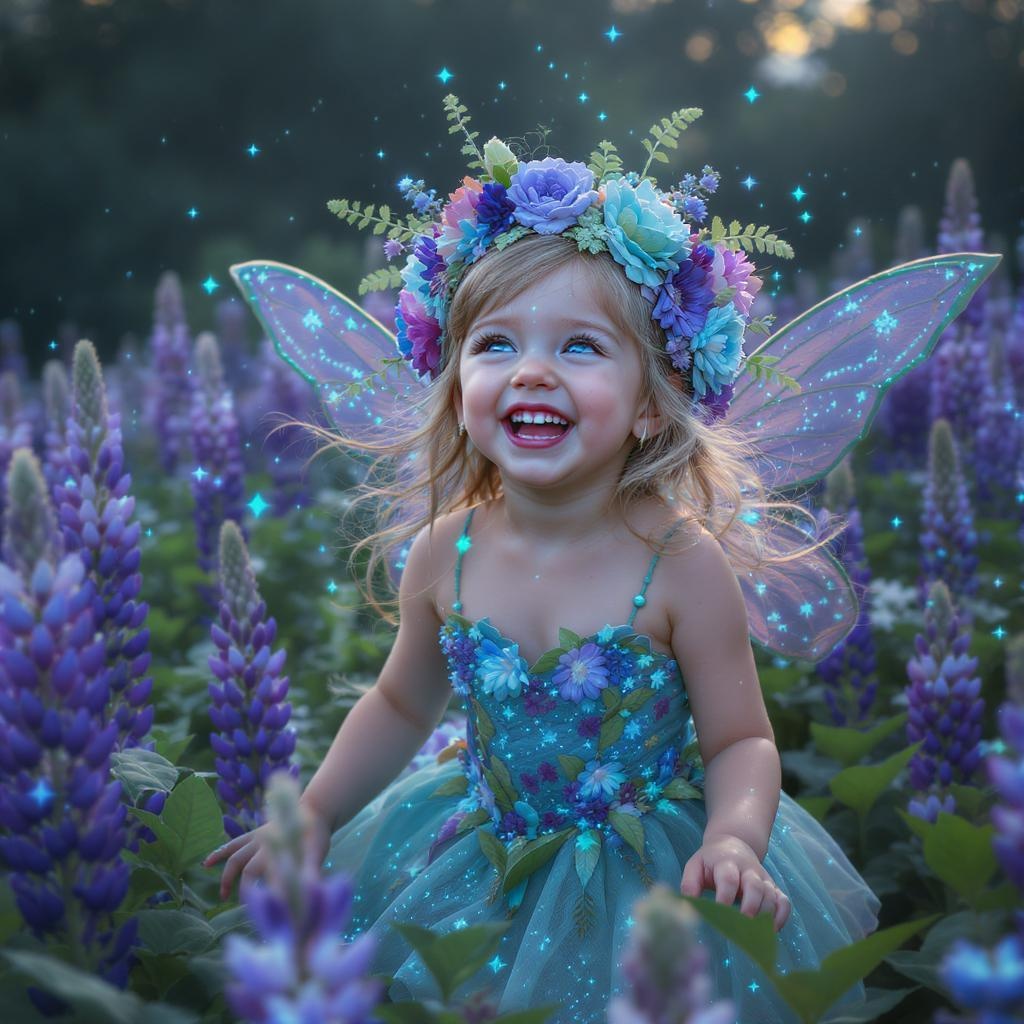 A wide-shot full body portrait captures a joyous five-year-old kawaii flower fairy girl as she plays among the tall lupine flowers in a field. Her laughter echoes with infectious happiness, her eyes dreamily gazing into the distance, embodying a lucid weirdcore cybercore dream aesthetic. She is adorned with an intricately detailed floral headdress that bursts with vibrant hues of blue, green, and purple, glowing with a magical allure. The background is a vivid wonderland, where each flower and leaf seems to shimmer with life, infused with particles that dance in shades of blue, green, and purple. The scene is composed according to the rule of thirds and golden ratio, with photorealism achieved through raytraced shadows and depth of field. An asymmetric composition enhances the hypermaximalist style, showcasing insane details that pop in octane render quality. The portrait features cinematic realism courtesy of Unreal Engine, presented in stunning 8K resolution to capture every nuance of this enchanting moment.