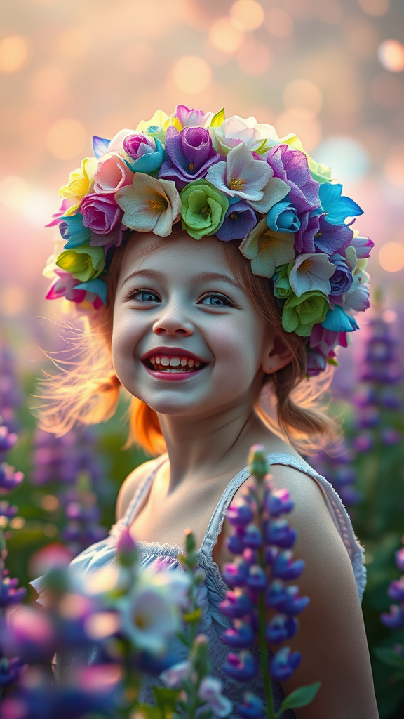 A wide-shot full body portrait of a joyful, giggling kawaii flower fairy girl, a 5-year-old delightfully immersed in a vibrant field of lupines, exuding a sense of wonder and mischief. Her eyes explore the horizon as her presence radiates a lucid weirdcore cybercore dream-like ambiance. She is adorned with an intricately detailed floral headdress, a masterpiece of marginalia bursting with colors of blue, green, and purple, casting a mesmerizing glow. The background is a glowing floral wonderland, a dreamscape alive with floating particles in shades of blue, green, and purple. This scene embraces the rule of thirds and the golden ratio, captured in photorealistic detail with raytraced shadows and a depth of field that creates an enchanting, asymmetric composition. A hypermaximalist approach unfolds with insane details, rendered with octane precision to achieve cinematic realism, reminiscent of an unreal engine masterpiece, delivered in breathtaking 8k resolution.