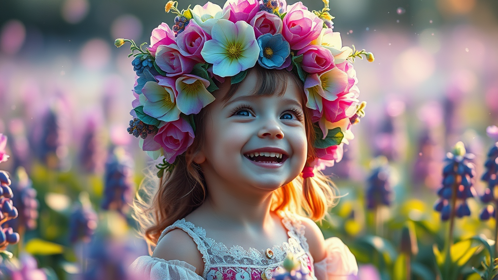 A wide-shot full-body portrait of a joyful, giggling kawaii flower fairy girl, 5 years old, as she frolics through a lupine field, capturing a whimsical essence. She gazes dreamily into the distance, embodying lucid weirdcore and cybercore aesthetics. Her style is adorned with an insanely detailed and intricately designed marginalia floral headdress, bursting with vibrant colors of blue, green, and purple, and emitting a soft glow. The background unfolds as a glowing floral vivid wonderland, with dream-like particles in shades of blue, green, and purple bathing the scene. The composition adheres to the rule of thirds and the golden ratio, characterized by photorealism, with raytraced shadows enhancing depth of field. The asymmetric composition radiates hypermaximalism, showcasing insane details through an octane render, achieving cinematic realism powered by an unreal engine, in striking 8k resolution.