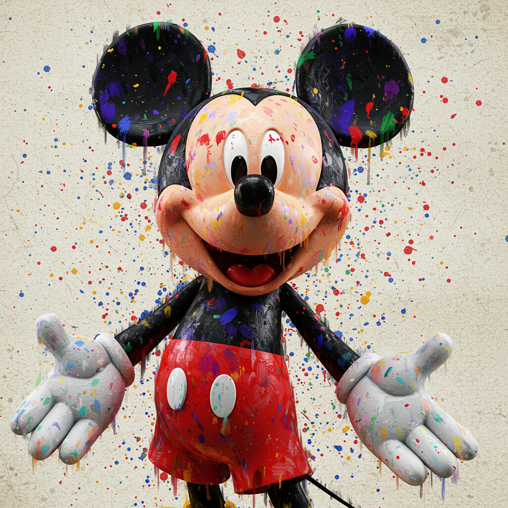 A wild and emotional abstract interpretation of Mickey Mouse emerges with a vivid palette, set against a backdrop reminiscent of Jackson Pollock's chaotic splatters. This impressionistic piece captures the essence of high art, suitable for a MoMA magazine feature, blending the worlds of traditional painting and 3D modeling. Exploring the realms of Maya, this artwork showcases a color-splattered face and body rendered in high-resolution texture, ensuring every brushstroke and splash is captured in stunning 4K detail. This professional photographic representation stands as an award-winning masterpiece, defying conventional boundaries with its bold and vibrant expression.