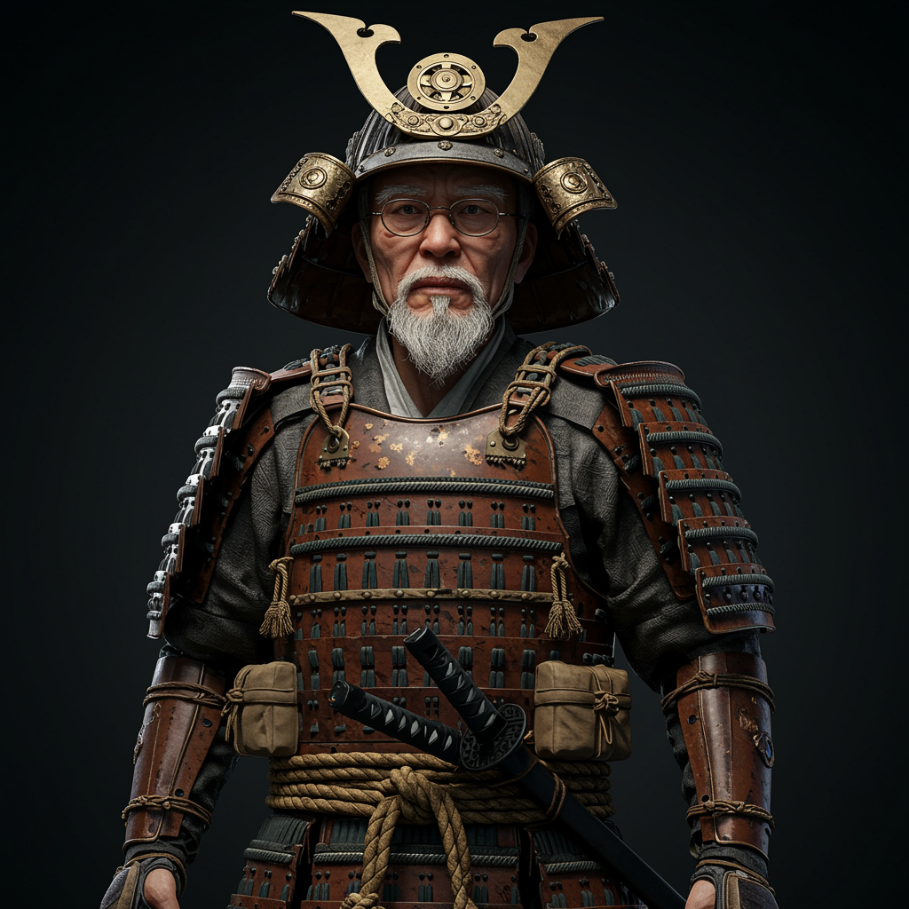 A wise elderly man clad in elaborately detailed samurai armor fused with advanced techwear, each piece intricately rendered to showcase a harmony between tradition and futuristic design, against a backdrop of dramatic studio lighting that highlights the craftsmanship and character lines on his face, emanating authority and wisdom with piercing eyes that tell a thousand stories. His hands are meticulously detailed, maintaining the seamless balance of the scene, he stands poised as a bridge between eras, encapsulated in a hyper-realistic portrait capturing the essence of time and innovation.
