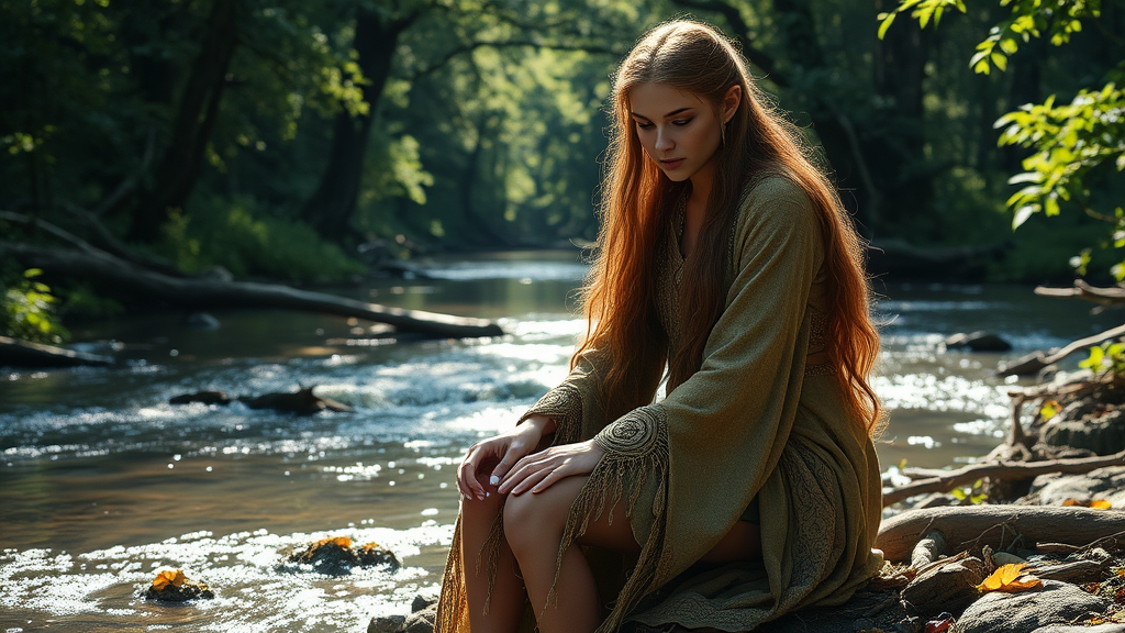 A wise elven druid, her detailed face and eyes reflecting centuries of knowledge, is kneeling by a river healing her wounded companion. Her graceful form, draped in intricately woven robes that blend harmoniously with the forest surroundings, glows softly under the dappled sunlight penetrating the trees. Her long, flowing hair cascades over her shoulders, embodying the essence of nature. Elira, a noble female elf from Dragonlance, is engaged in combat with an unseen threat. The scene is captured with photorealistic clarity and precision, reminiscent of the artistic styles of Jeremy Mann, Sandra Chevrier, and Maciej Kuciara. The vibrant 8k rendering showcases realistic textures and real shadows, creating a sharp, three-dimensional masterpiece set against the backdrop of a gently flowing river.