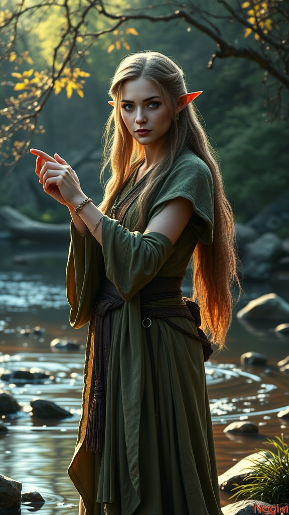 A wise female elf, inspired by Elira from Dragonlance, stands by a tranquil river, healing her companion with an air of serenity and focus amid the chaos of battle. As an elven druid, her connection to nature is profound, reflected in her serene yet commanding presence. Her detailed and expressive face showcases wisdom, with sharp, photorealistic features and piercing eyes that captivate all who meet her gaze. Rendered in masterpiece quality, the image is vivid at 8k resolution, bringing a hyper-realistic and immersive atmosphere to life. This depiction takes inspiration from the artistic styles of Jeremy Mann, Sandra Chevrier, and Maciej Kuciara, combining their unique elements to create a stunning visual. The elf's attire and surroundings are intricately detailed, her form possessing realistic shadows and three-dimensional depth. Her druidic garments flow naturally, reflecting both elegance and practicality in combat. Maintaining the core essence, the creative modifications emphasize a harmonious balance between fantasy and realism, detached from fantastical attributes such as additional limbs, exaggerated features, or mythical distortions.