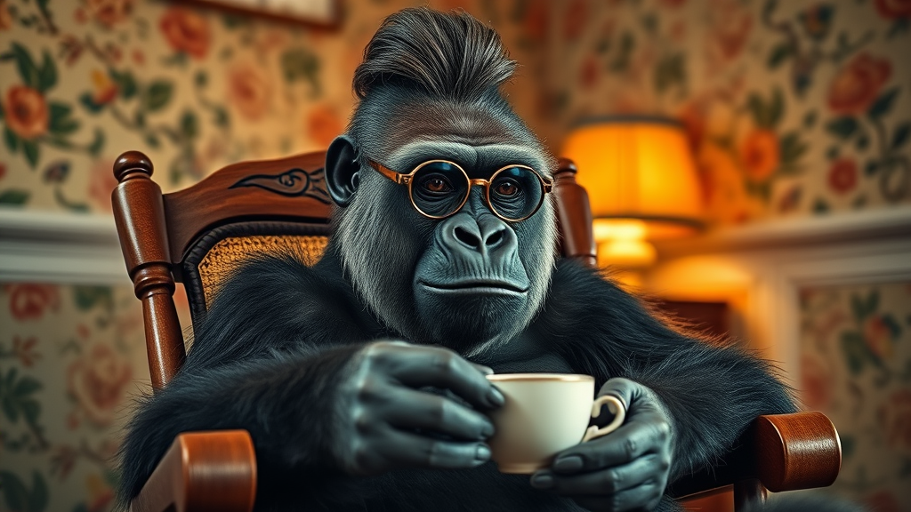 A wise gorilla with gray hair styled in a neat bun, wearing round spectacles, comfortably seated in a vintage rocking chair amidst a backdrop of colorful floral wallpaper, delicately holding a porcelain teacup. The ambiance is bathed in warm, inviting lights, suggesting a cozy and serene setting.