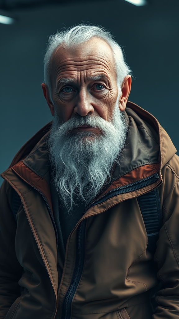 A wise grandfather dressed in cutting-edge techwear, captured with ultra-realistic detail, illuminated by precise studio lighting, surrounded by a futuristic, minimalistic environment. His face tells stories of both past wisdom and present innovation, with every wrinkle and beard hair rendered in intricate detail, juxtaposed against the sleek, modern apparel that blends functionality with style. The environment is enhanced by subtle neural network graphics, hinting at a world where tradition meets technology. The essence is one of harmonious balance, where age-old knowledge merges seamlessly with the avant-garde.