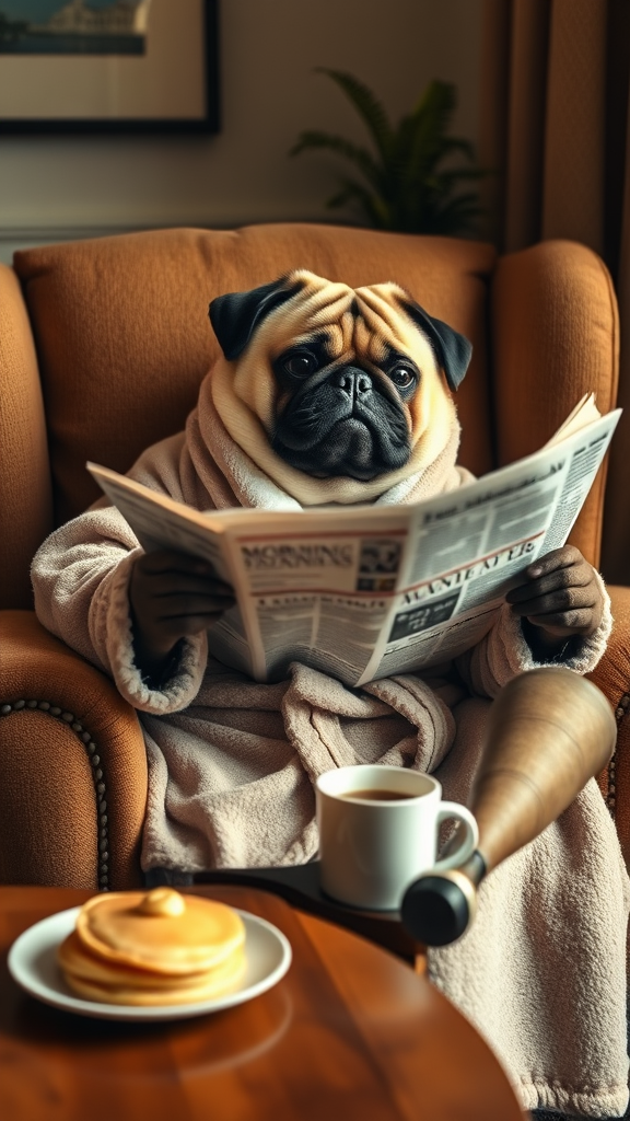 A wise-looking anthropomorphic pug dog sits in a cozy armchair, donning a plush robe, leisurely enjoying a breakfast of fluffy pancakes and freshly brewed coffee. The pug is deeply engrossed in a morning newspaper, its expression thoughtful and serene. The scene is set in a warmly lit room, capturing a cinematic and high dynamic range atmosphere. Soft, soothing tones enrich the visual experience, highlighting intricate details such as the gentle folds of the robe and the delicate steam rising from the coffee cup. The overall mood is calm and inviting, with a low contrast palette that enhances the elegance and calm of the morning ritual.